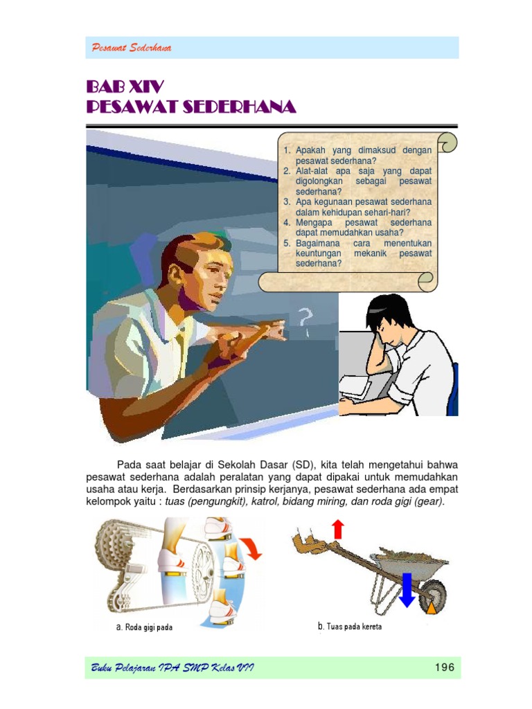 Pesawat sederhana ialah alat bantu yang diciptakan untuk mempermudah pekerjaan manusia. Pesawat sederhana adalah sebuah alat mekanik yang mampu merubah arah atau besaran yang timbul dari sebuah gaya. Pesawat sederhana adalah suatu alat yang digunakan untuk mempermudah melakukan usaha. Pesawat sederhana adalah alat serbaguna yang disusun dengan cara sederhana yang dapat meringankan atau memudahkan pekerjaan manusia. Membantu manusia melakukan pekerjaan berat menjadi lebih ringan; Tujuan pesawat sederhana adalah melipatgandakan gaya atau kemampuan, mengubah arah gaya, dan memperbesar kecepatan. Keuntungan pesawat sederhana • pesawat sederhana tidak mengurangi besarnya usaha • pesawat sederhana memperkecil gaya perhatikan uraian berikut 7 7. Memperbesar kecepatan atau untuk melakukan perpindahan yang besar. Perbandingan antara beban dan kuasa adalah sama dengan perbandingan antara lengan kuasa dan lengan beban. Karena pesawat sederhana dapat mengubah energi, mengubah arah, mengurangi gaya serta memperbesar kecepatan. Keuntungan yang diperoleh didapat jika jarak antara titik tumpu. Kuasa adalah gaya yang diberikan oleh tangan untuk mendorong tuas. Pesawat sederhana dibuat dengan tujuan untuk :